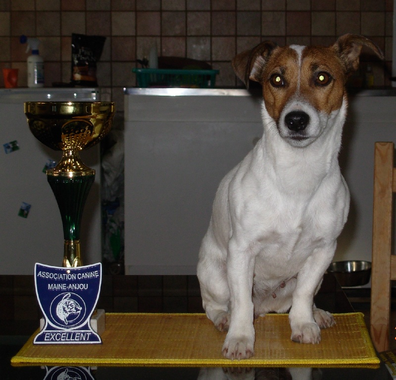 Classe Travaille sur 3 chiens. P: 43cm t:29 cm DCC Jolie tête , crâne pourrais être un peu plus plat, œil de bonne couleur , Les oreilles pourrait être un peux mieux dirigé , exc format , Exc construction , exc angulation avant et arrière ,Robe Blanche avec marque orange sur le cote et en tête , allures faciles .